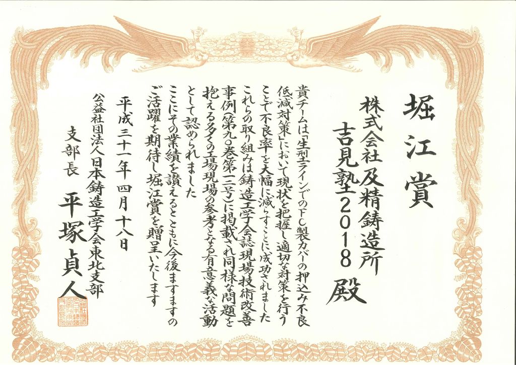 今年度、弊社では現場改善サークル「吉見塾2018」が学会誌に投稿した現場改善事例「生型ラインでのFC製カバーの押込み不良低減対策」が堀江賞を受賞いたしました。